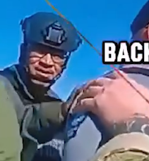 In the photo, one officer is seen gesturing assertively while another keeps a steady hand on him, signaling control amid the tense atmosphere. Bold text reading “STEP BACK” overlays the image, highlighting both the intensity of the moment and why it has quickly gained traction across social media platforms.